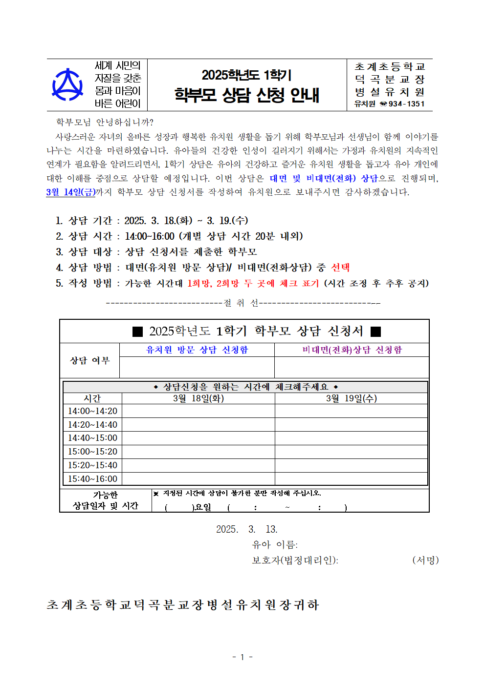 2025학년도 1학기 학부모 상담 신청 안내