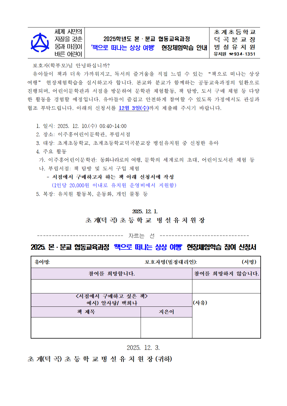 2025학년도 본·분교 협동교육과정 현장체험학습 안내(책으로 떠나는 상상여행)